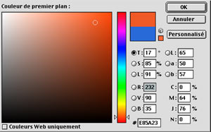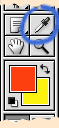 Vous pouvez aussi aller choisir votre couleur sur l'image, en dehors du sélecteur. Vous voyez alors le pointeur de souris prendre la forme de la pipette, et vous pouvez cliquer n'importe où. Vous pouvez aussi cliquer sur l'un des pavés de couleur de la barre d'outil (très utile si vous voulez un avant-plan et un arrière-plan de même teinte, mais avec des densités différentes).